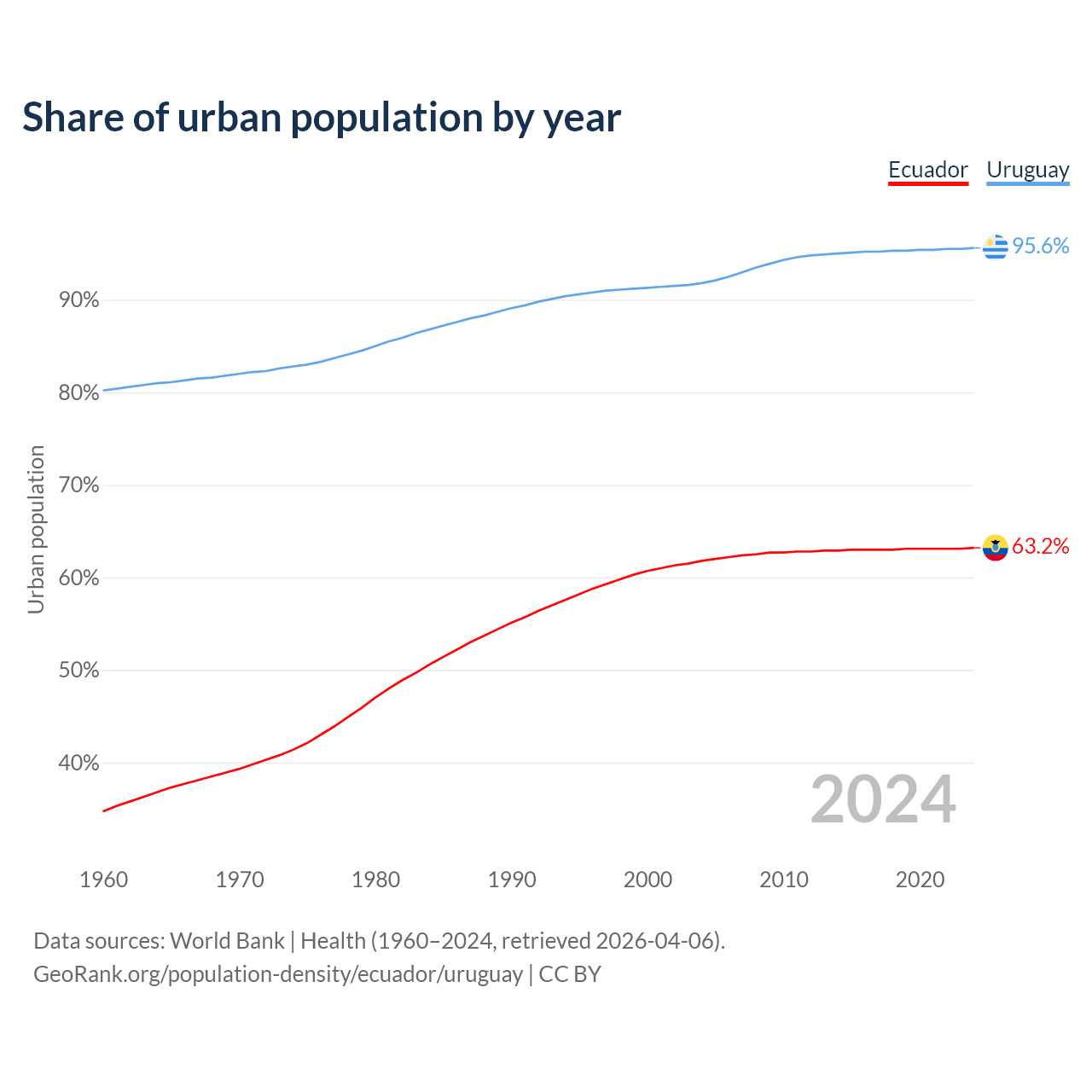 From 2004 to 2024, the share of urban population changed from 61.8% to 63.2% in Ecuador and from 91.8% to 95.6% in Uruguay.