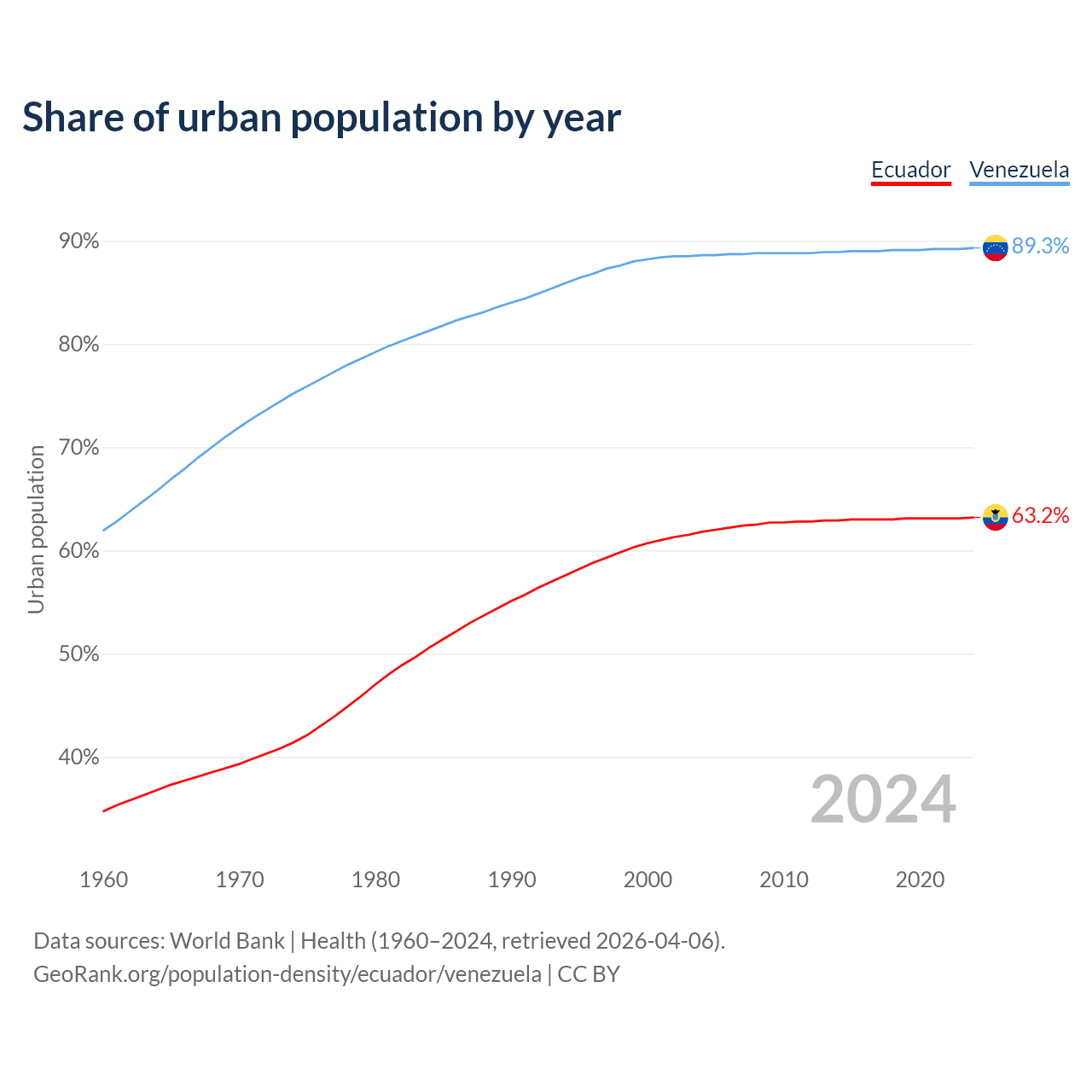 From 2004 to 2024, the share of urban population changed from 61.8% to 63.2% in Ecuador and from 88.6% to 89.3% in Venezuela.