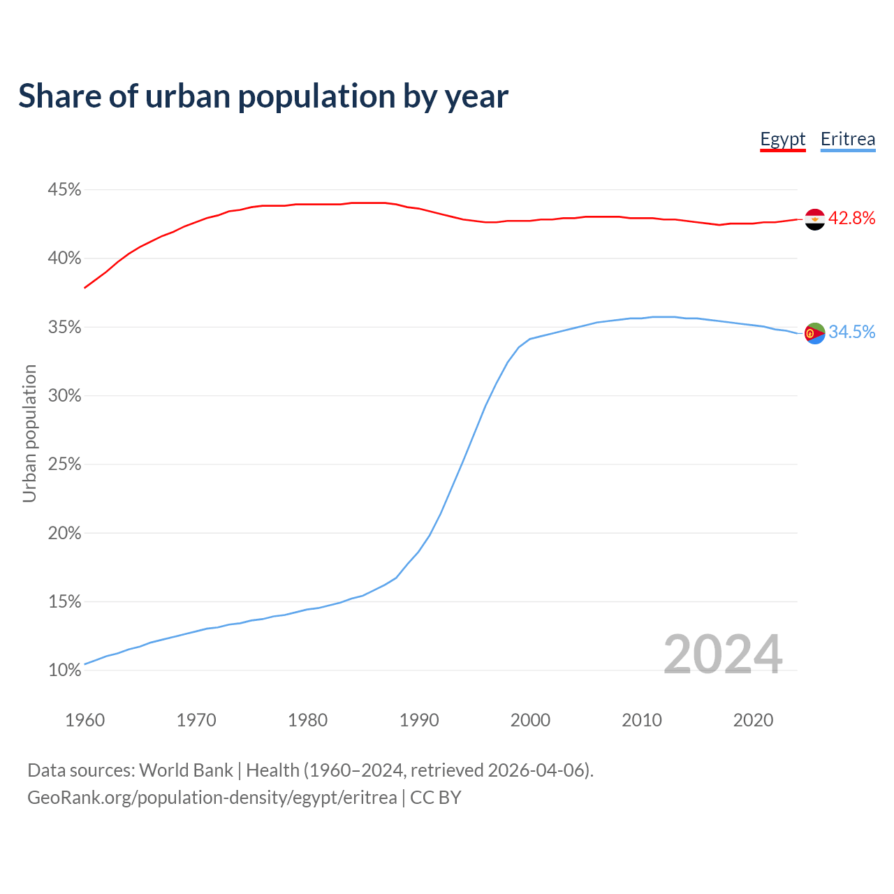 From 2006 to 2026, population density in Egypt increased by 45.4%, compared to a 35.9% growth in Eritrea.