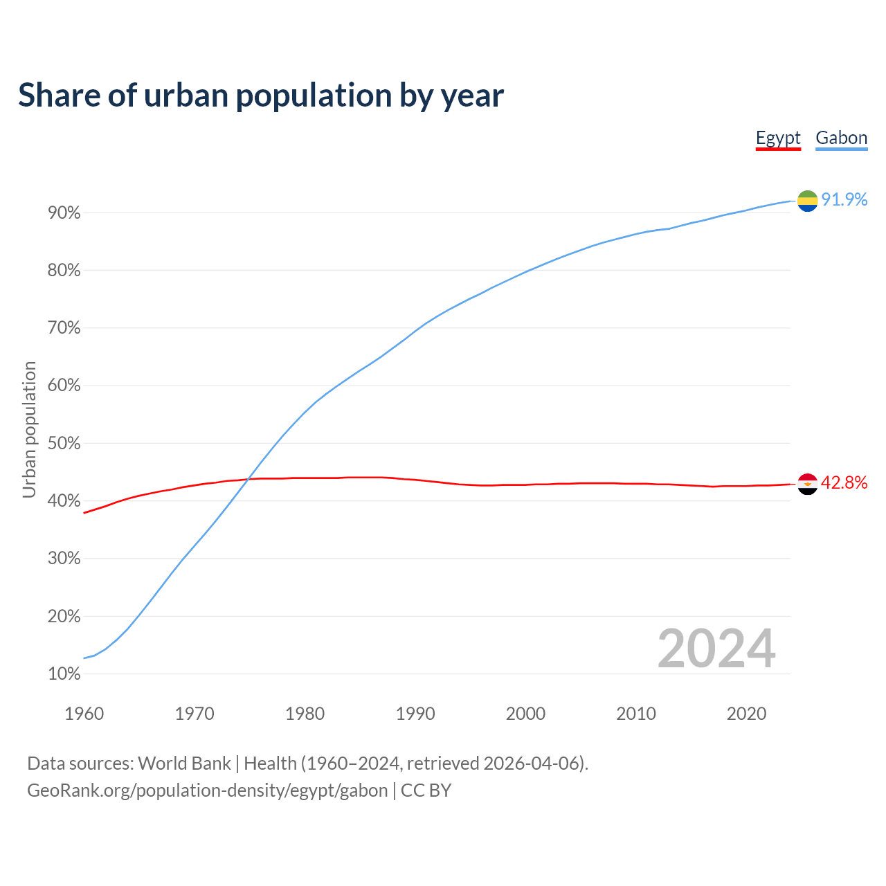 From 2004 to 2024, the share of urban population changed from 42.9% to 42.8% in Egypt and from 82.7% to 91.9% in Gabon.