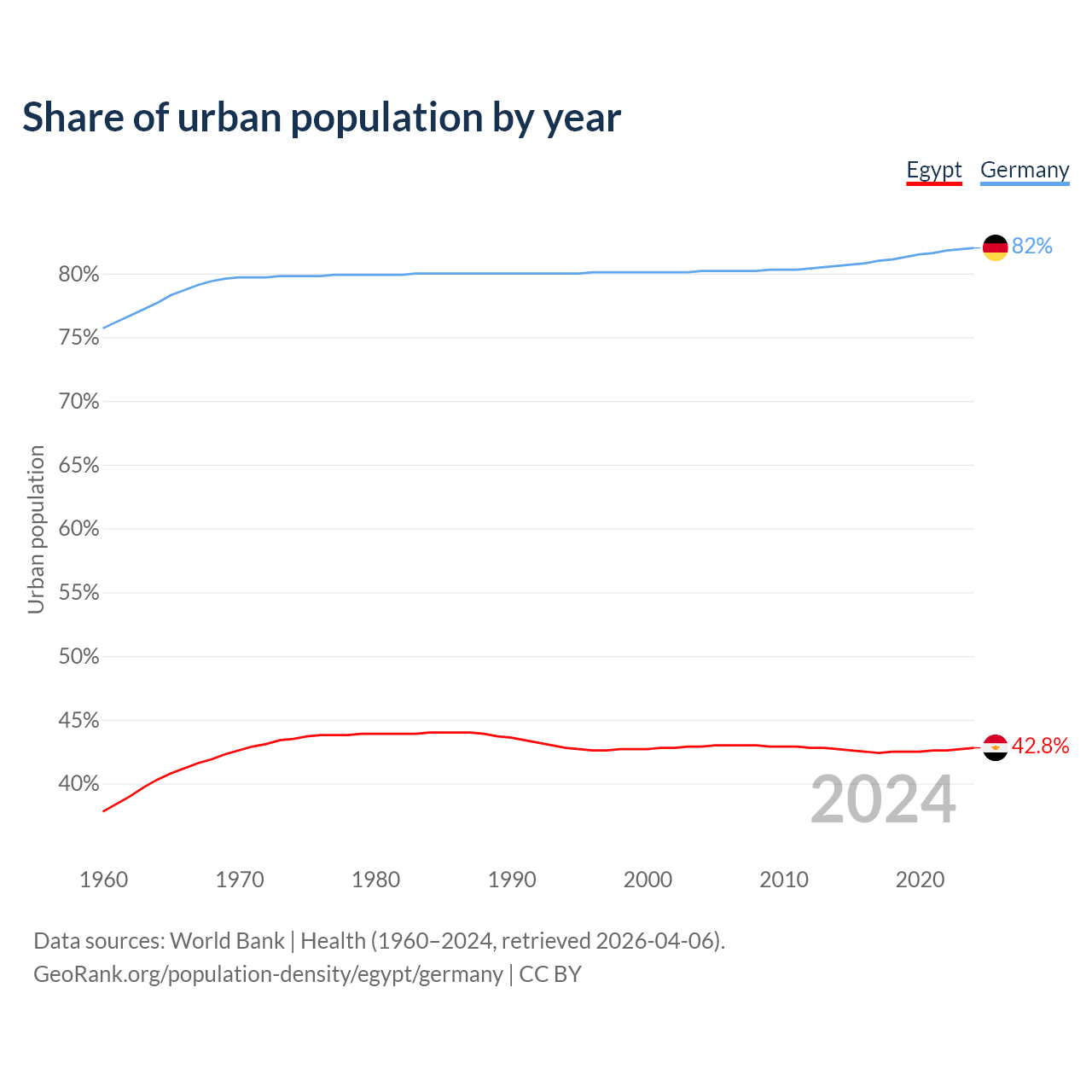 From 2004 to 2024, the share of urban population changed from 42.9% to 42.8% in Egypt and from 80.2% to 82% in Germany.