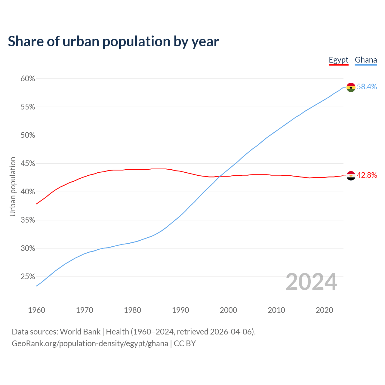 From 2004 to 2024, the share of urban population changed from 42.9% to 42.8% in Egypt and from 46.8% to 58.4% in Ghana.