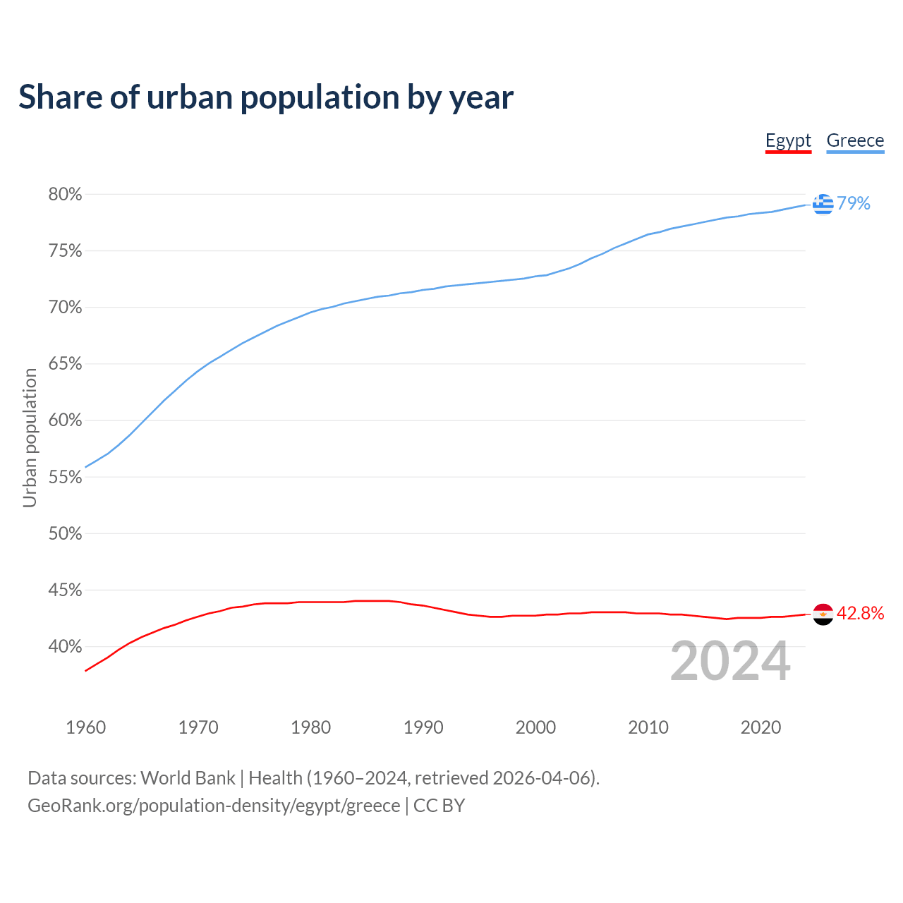 From 2004 to 2024, the share of urban population changed from 42.9% to 42.8% in Egypt and from 73.8% to 79% in Greece.