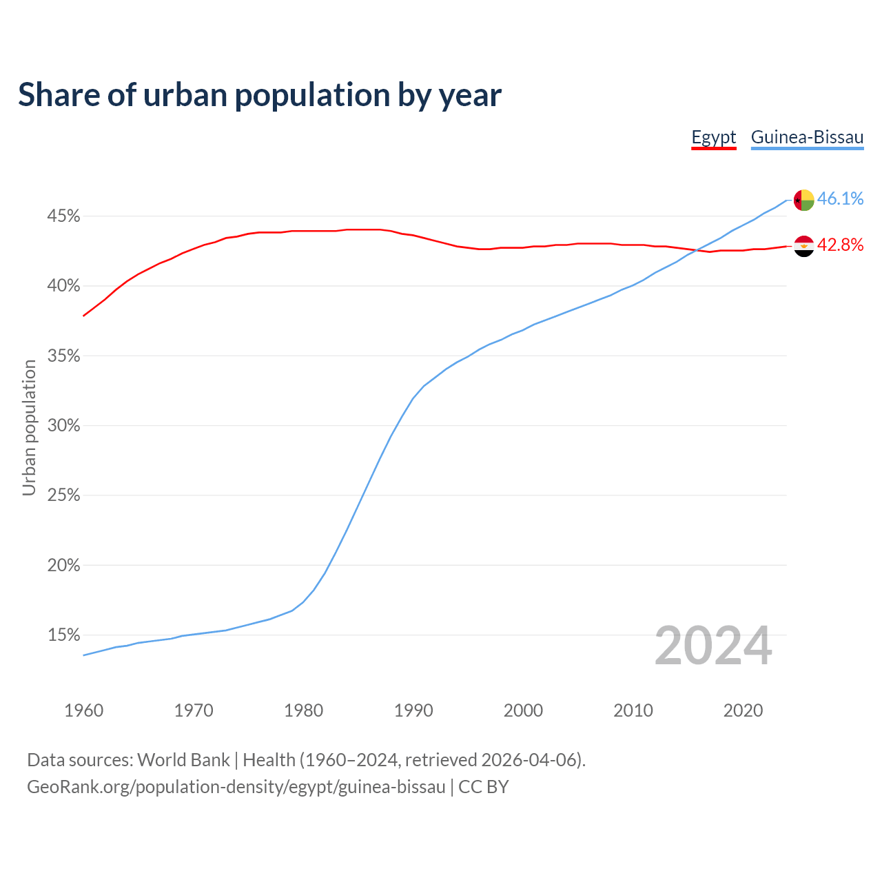 From 2004 to 2024, the share of urban population changed from 42.9% to 42.8% in Egypt and from 38.1% to 46.1% in Guinea-Bissau.