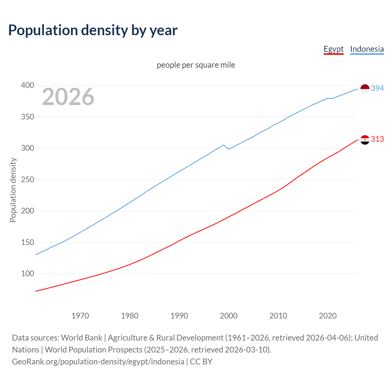 Egypt has a population density of 313 people per square mile compared to 394 people in Indonesia. Egypt has 93,325 sq ft of land per person vs 72,316 sq ft in Indonesia. Egypt and Indonesia rank 79th and 64th by population density, respectively.