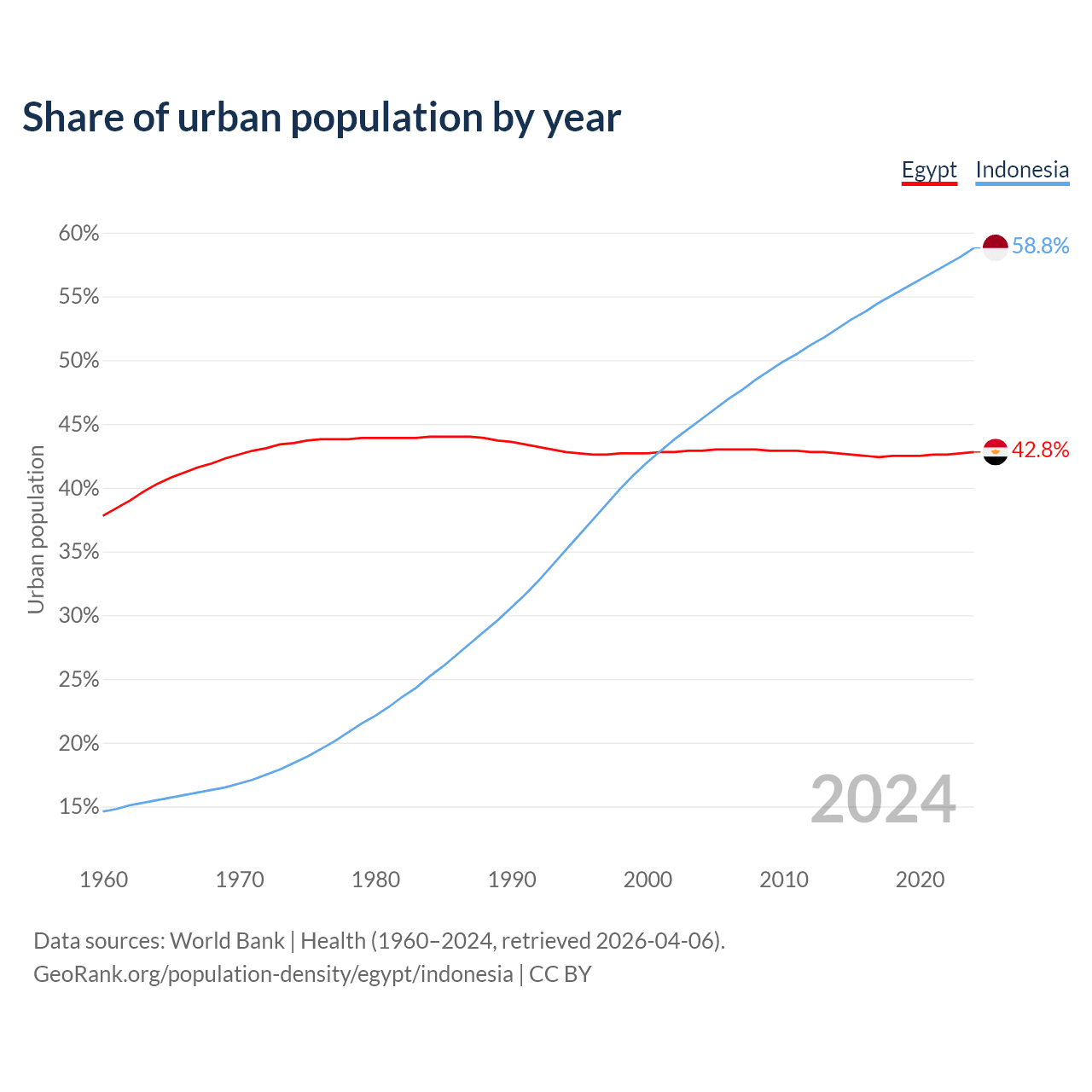 From 2004 to 2024, the share of urban population changed from 42.9% to 42.8% in Egypt and from 45.4% to 58.8% in Indonesia.