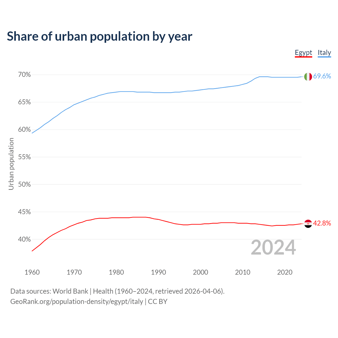 From 2004 to 2024, the share of urban population changed from 42.9% to 42.8% in Egypt and from 67.5% to 69.6% in Italy.