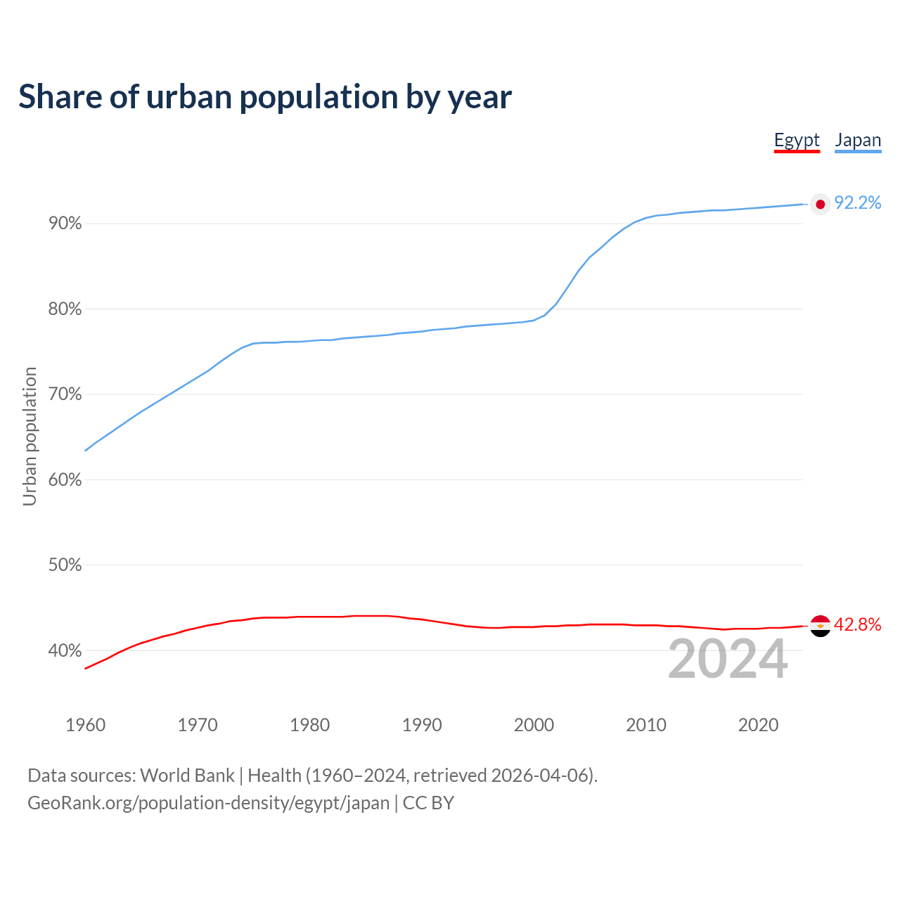 From 2004 to 2024, the share of urban population changed from 42.9% to 42.8% in Egypt and from 84.4% to 92.2% in Japan.