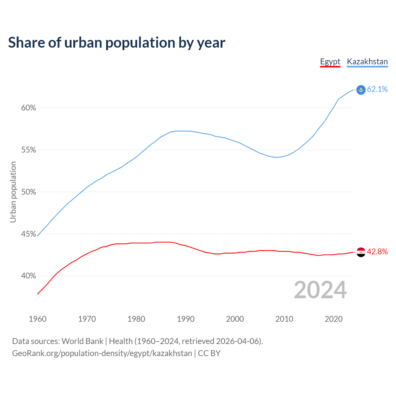 From 2004 to 2024, the share of urban population changed from 42.9% to 42.8% in Egypt and from 54.9% to 62.1% in Kazakhstan.