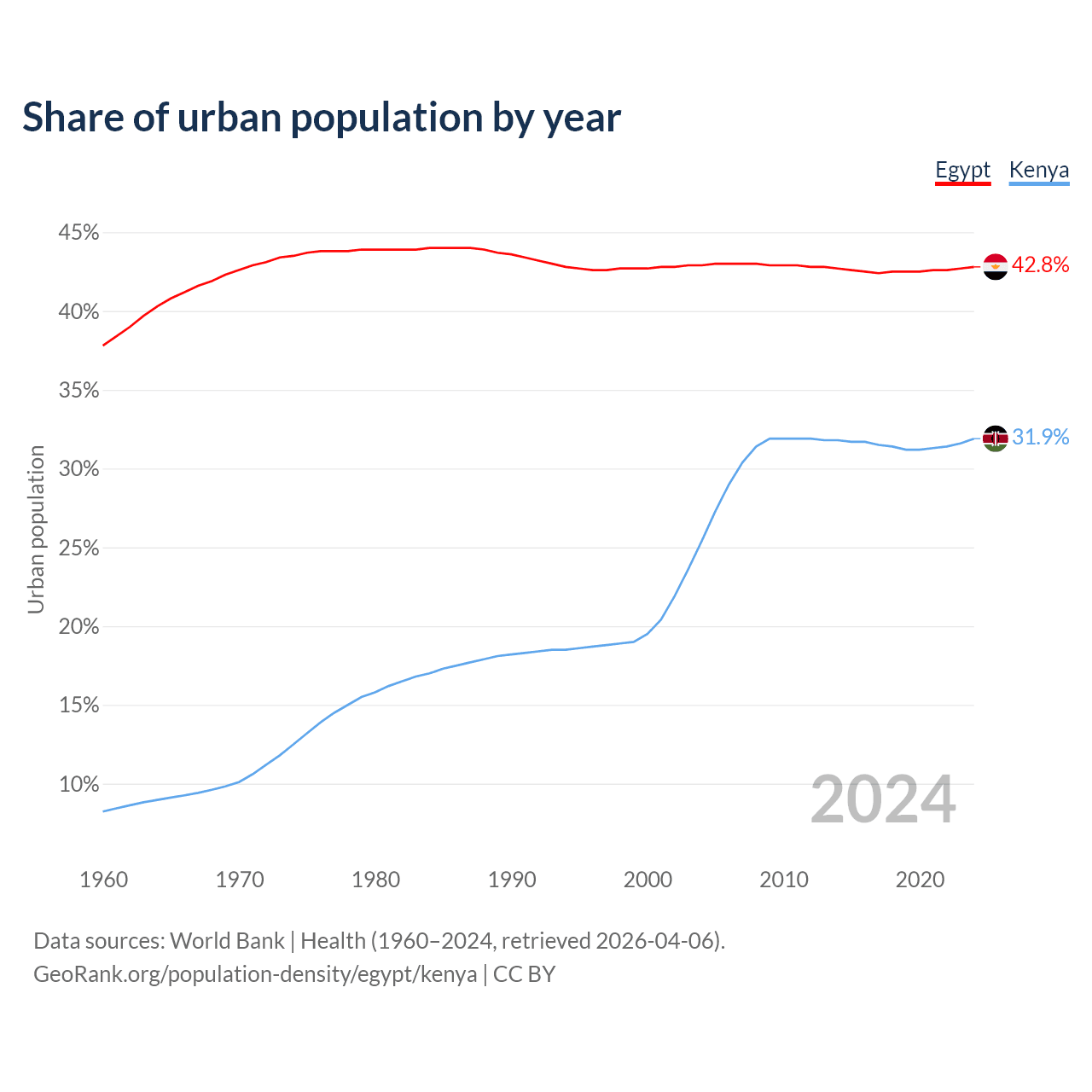 From 2004 to 2024, the share of urban population changed from 42.9% to 42.8% in Egypt and from 25.4% to 31.9% in Kenya.