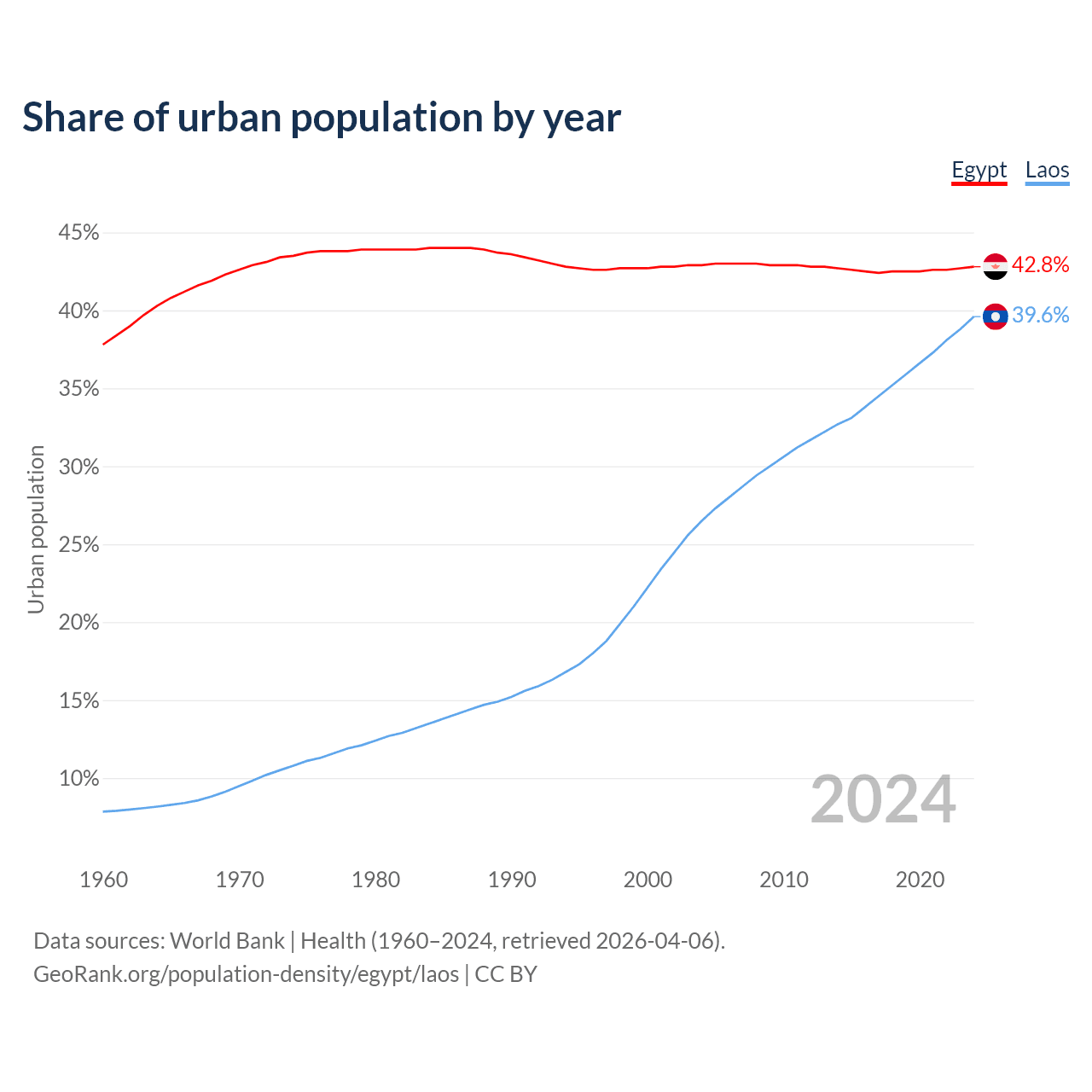 From 2004 to 2024, the share of urban population changed from 42.9% to 42.8% in Egypt and from 26.5% to 39.6% in Laos.