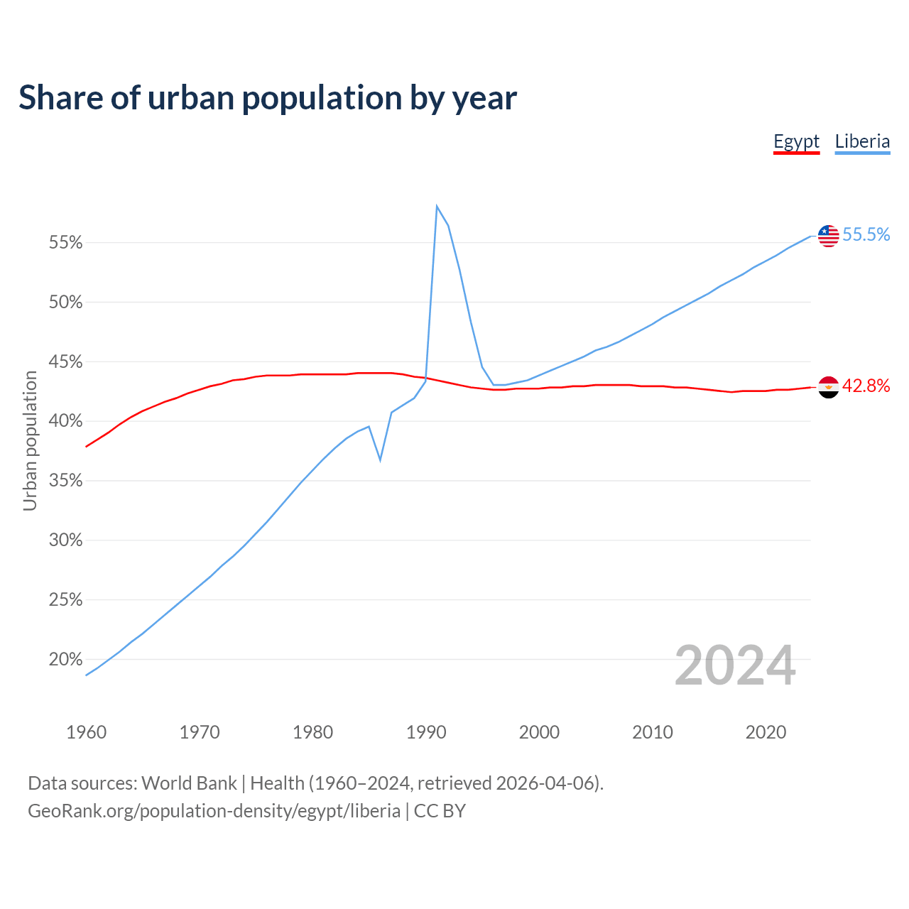 From 2004 to 2024, the share of urban population changed from 42.9% to 42.8% in Egypt and from 45.4% to 55.5% in Liberia.