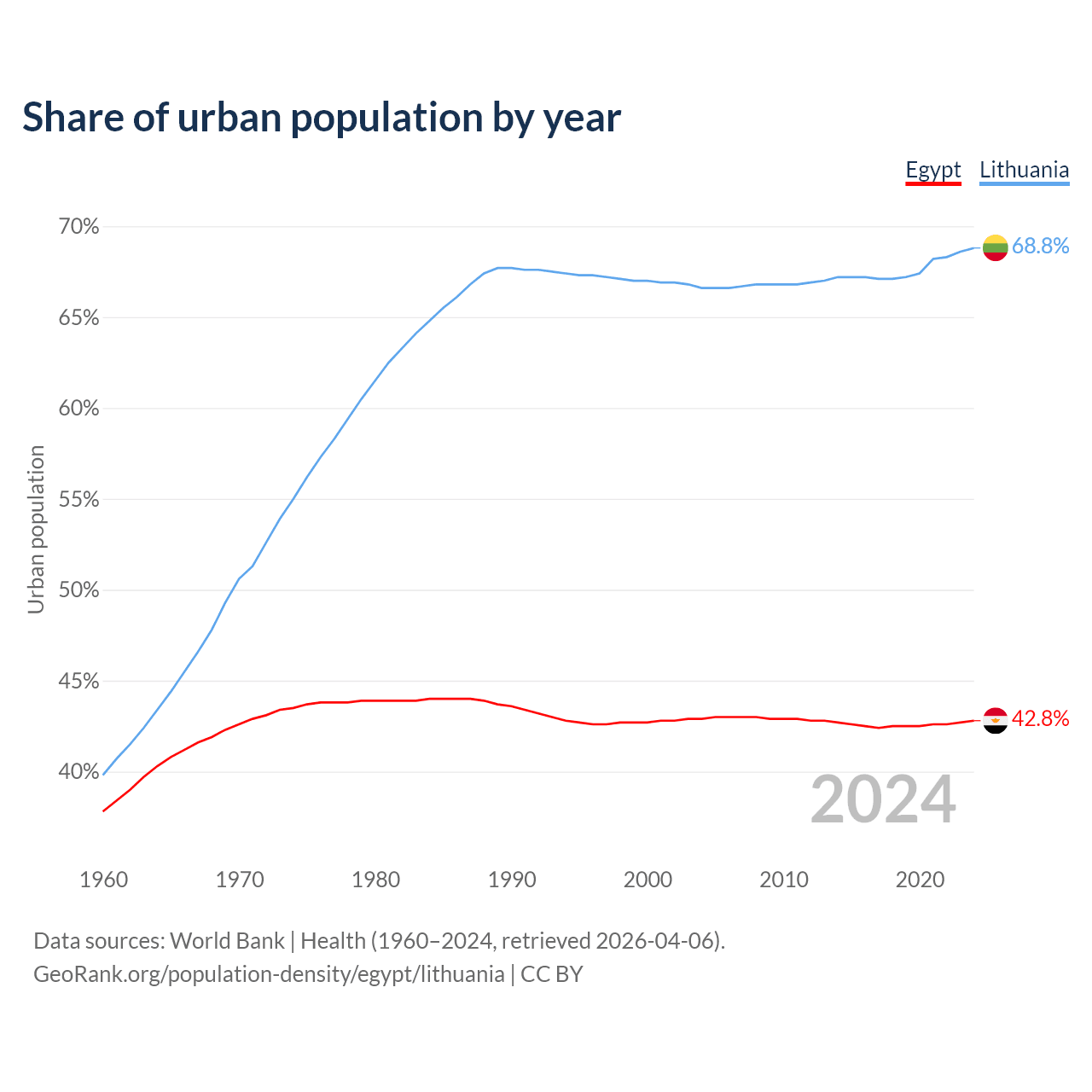 From 2004 to 2024, the share of urban population changed from 42.9% to 42.8% in Egypt and from 66.6% to 68.8% in Lithuania.