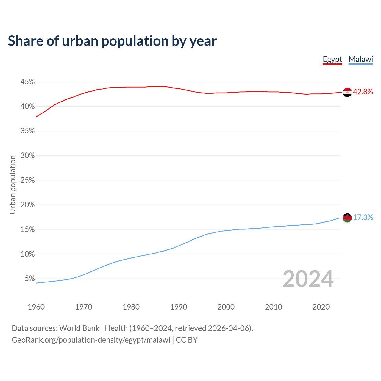 From 2004 to 2024, the share of urban population changed from 42.9% to 42.8% in Egypt and from 15% to 17.3% in Malawi.