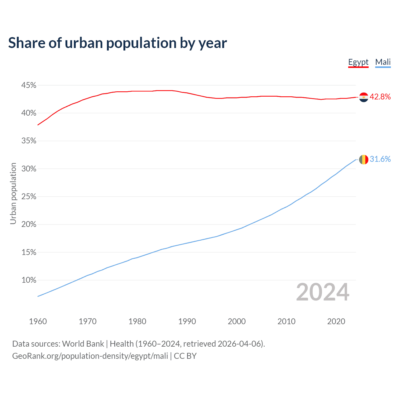 From 2004 to 2024, the share of urban population changed from 42.9% to 42.8% in Egypt and from 20.5% to 31.6% in Mali.