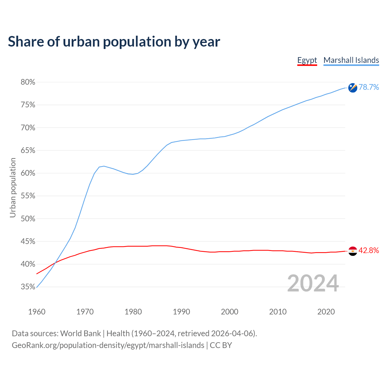 From 2004 to 2024, the share of urban population changed from 42.9% to 42.8% in Egypt and from 70.1% to 78.7% in the Marshall Islands.