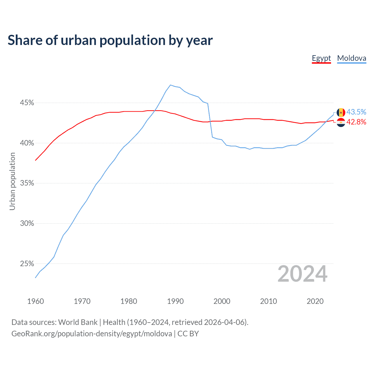 From 2004 to 2024, the share of urban population changed from 42.9% to 42.8% in Egypt and from 39.4% to 43.5% in Moldova.