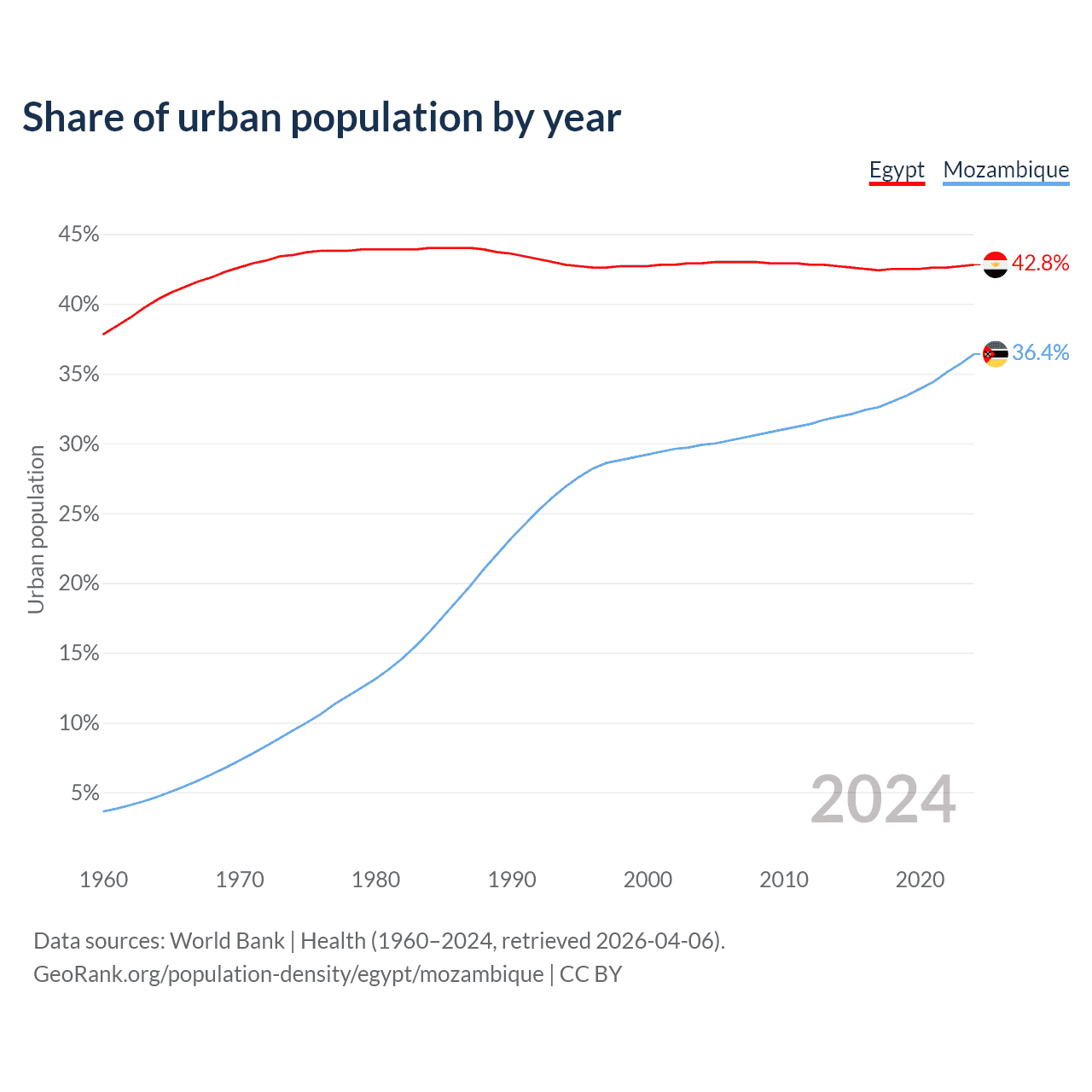 From 2004 to 2024, the share of urban population changed from 42.9% to 42.8% in Egypt and from 29.9% to 36.4% in Mozambique.
