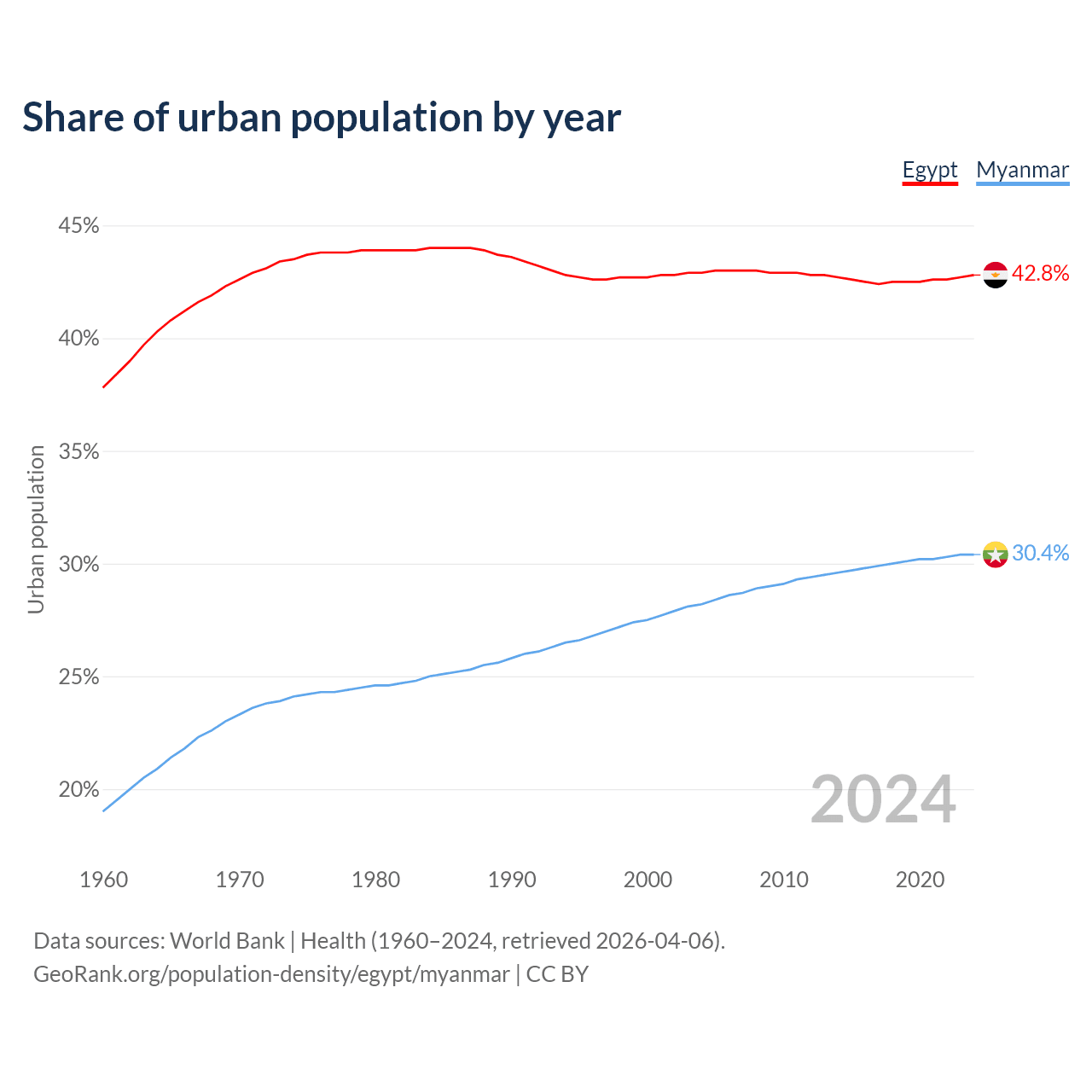 From 2004 to 2024, the share of urban population changed from 42.9% to 42.8% in Egypt and from 28.2% to 30.4% in Myanmar.