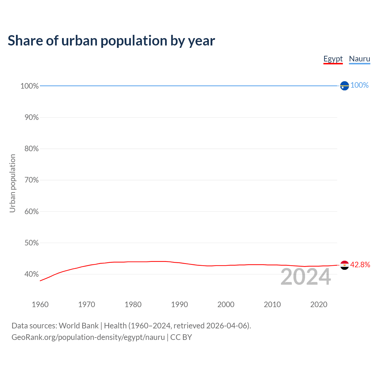 From 2004 to 2024, the share of urban population changed from 42.9% to 42.8% in Egypt and from 100% to 100% in Nauru.