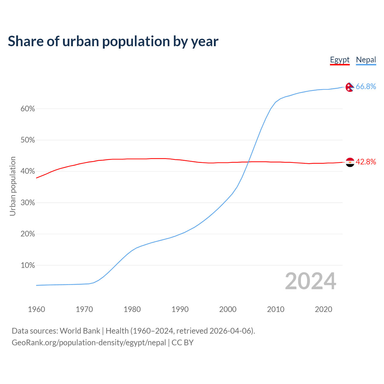 From 2004 to 2024, the share of urban population changed from 42.9% to 42.8% in Egypt and from 41.6% to 66.8% in Nepal.