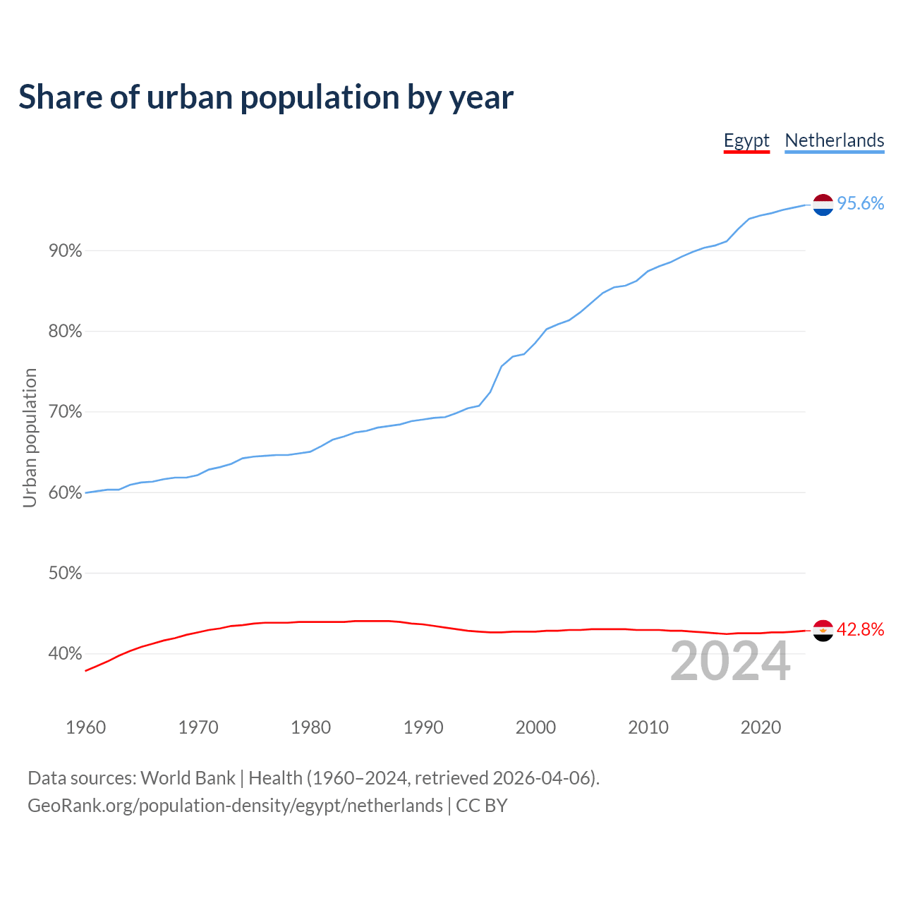 From 2004 to 2024, the share of urban population changed from 42.9% to 42.8% in Egypt and from 82.3% to 95.6% in the Netherlands.
