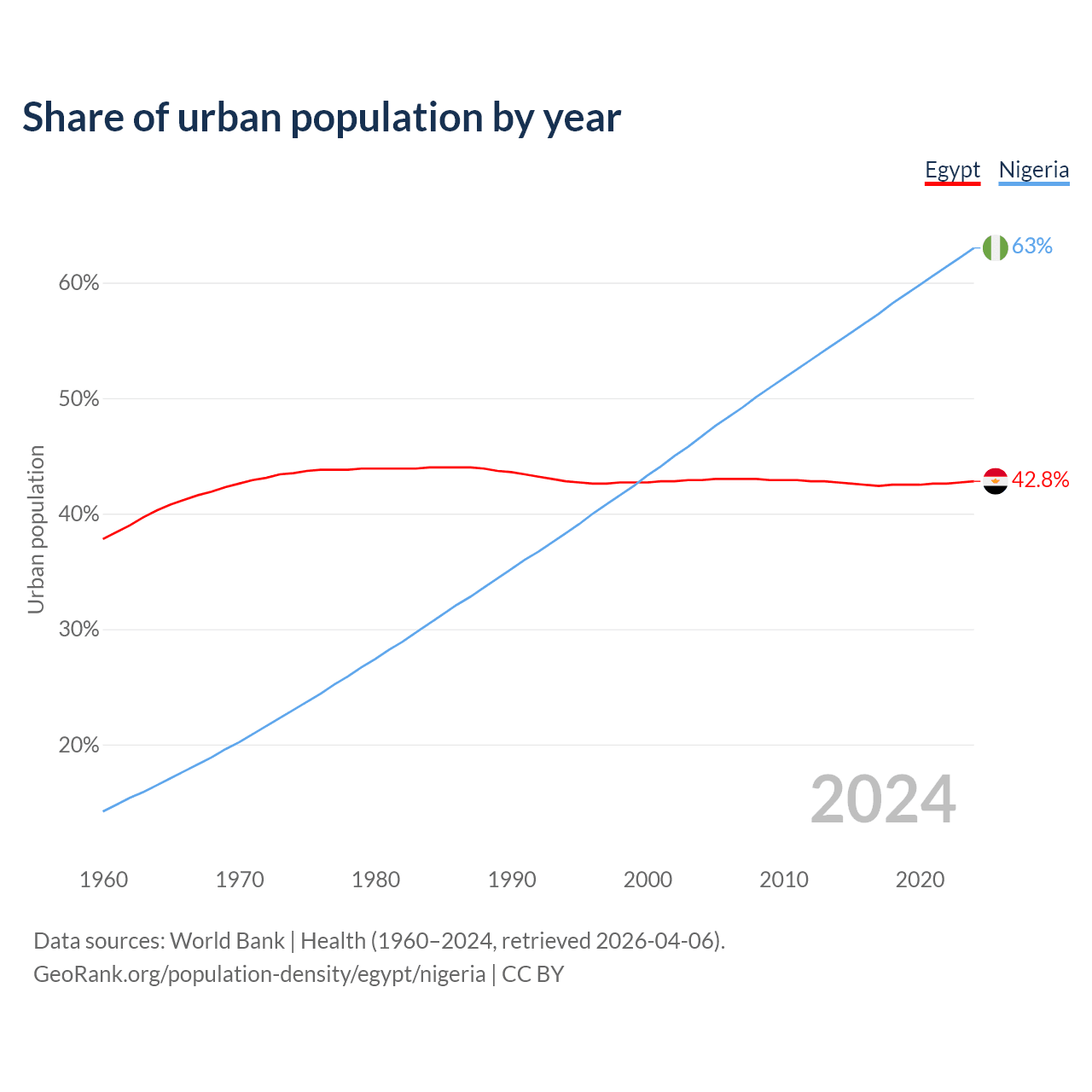 From 2004 to 2024, the share of urban population changed from 42.9% to 42.8% in Egypt and from 46.7% to 63% in Nigeria.
