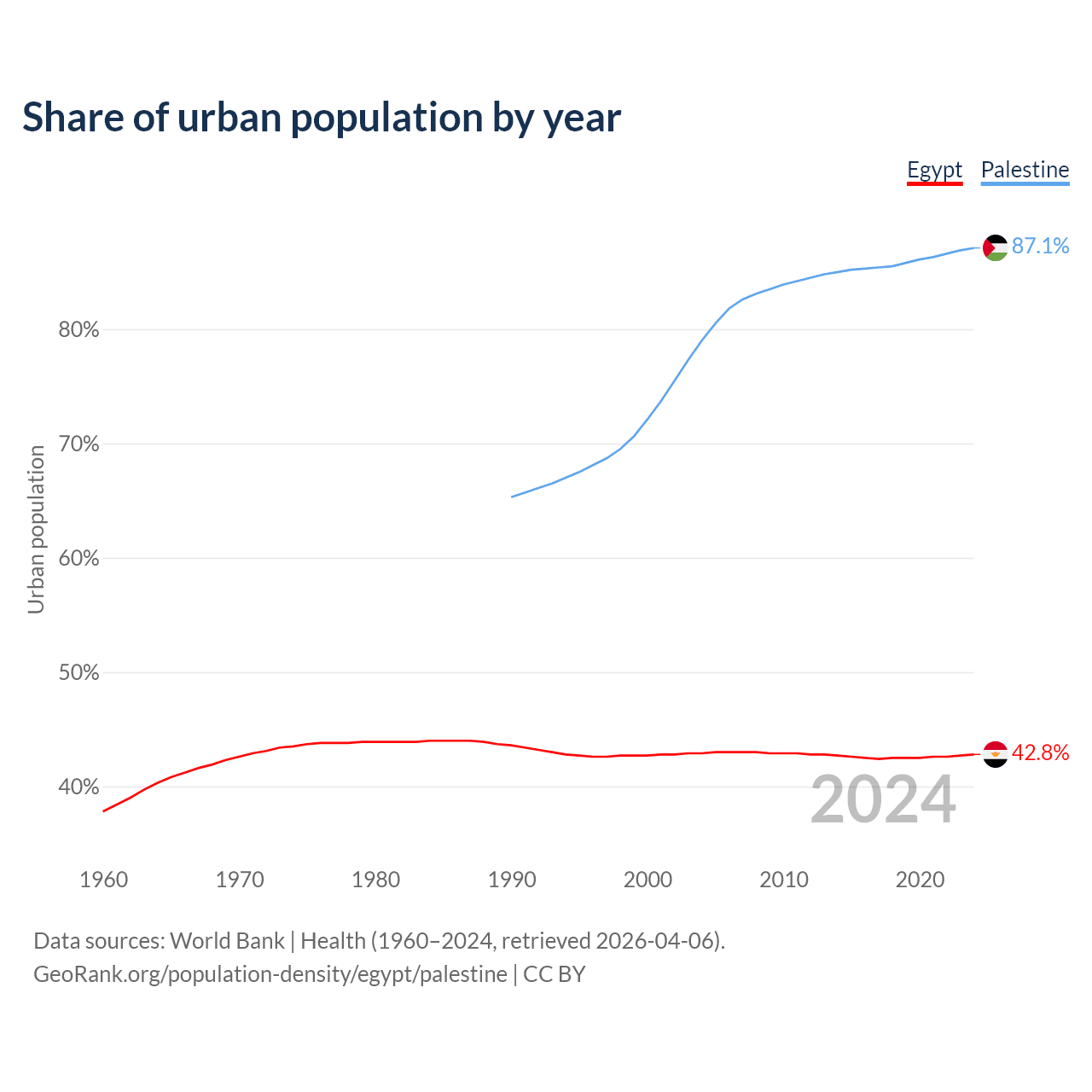 From 2004 to 2024, the share of urban population changed from 42.9% to 42.8% in Egypt and from 79% to 87.1% in Palestine.