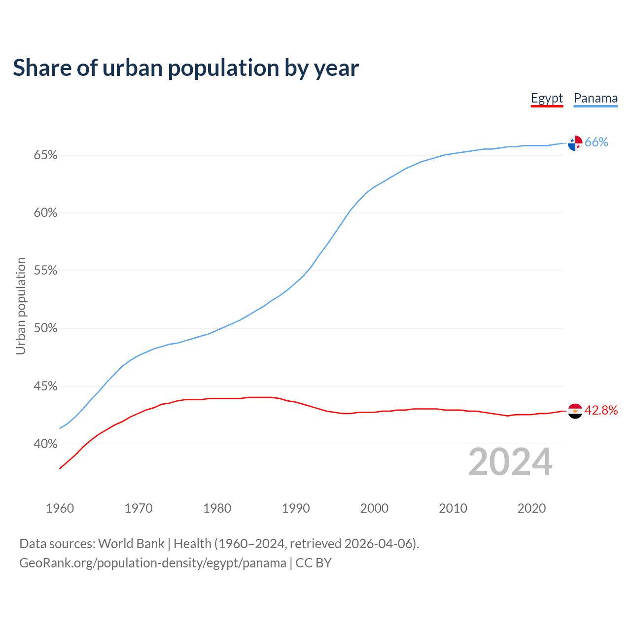 From 2004 to 2024, the share of urban population changed from 42.9% to 42.8% in Egypt and from 63.8% to 66% in Panama.