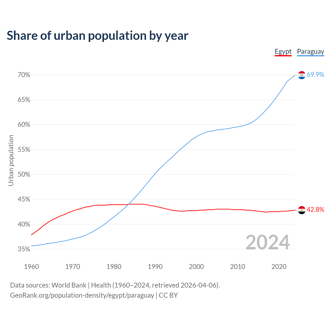 From 2004 to 2024, the share of urban population changed from 42.9% to 42.8% in Egypt and from 58.7% to 69.9% in Paraguay.