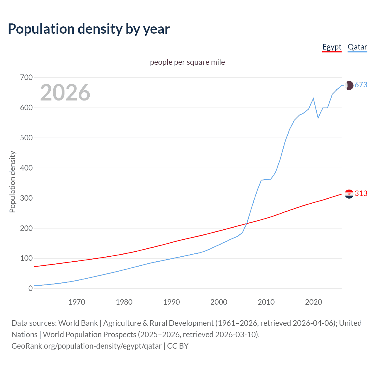 From 2006 to 2026, population density in Egypt increased by 45.4%, compared to a 210.1% growth in Qatar.