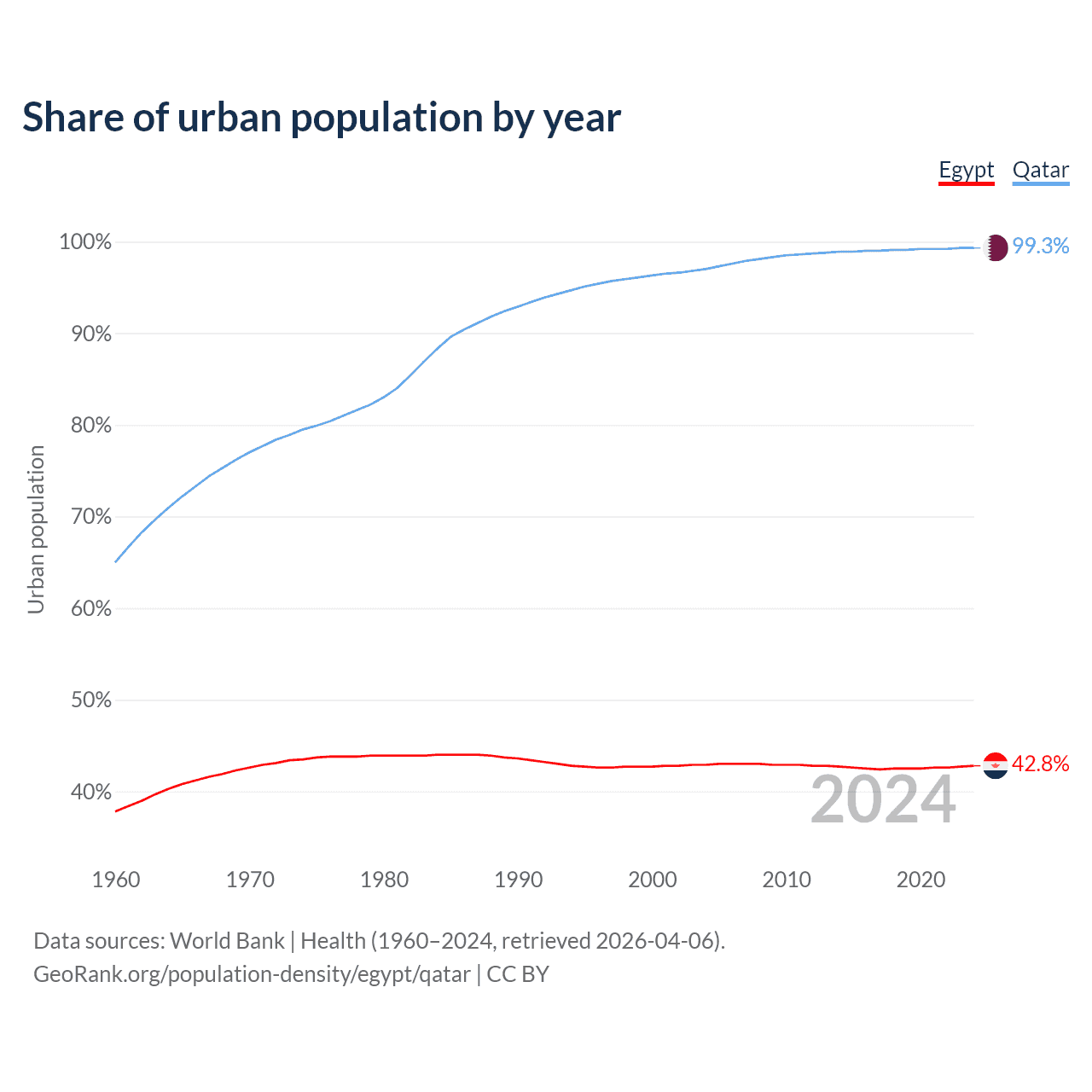 From 2004 to 2024, the share of urban population changed from 42.9% to 42.8% in Egypt and from 97% to 99.3% in Qatar.