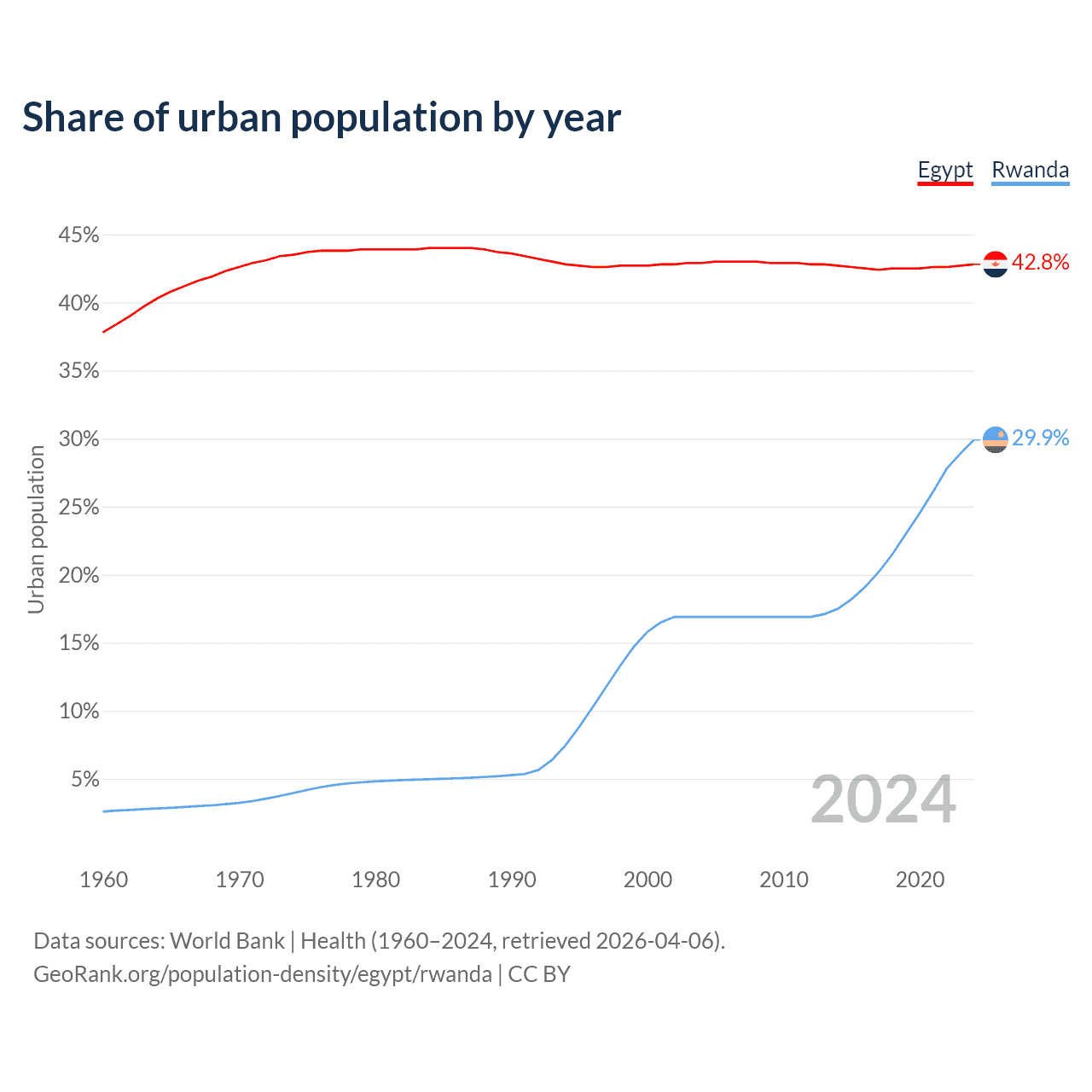 From 2004 to 2024, the share of urban population changed from 42.9% to 42.8% in Egypt and from 16.9% to 29.9% in Rwanda.