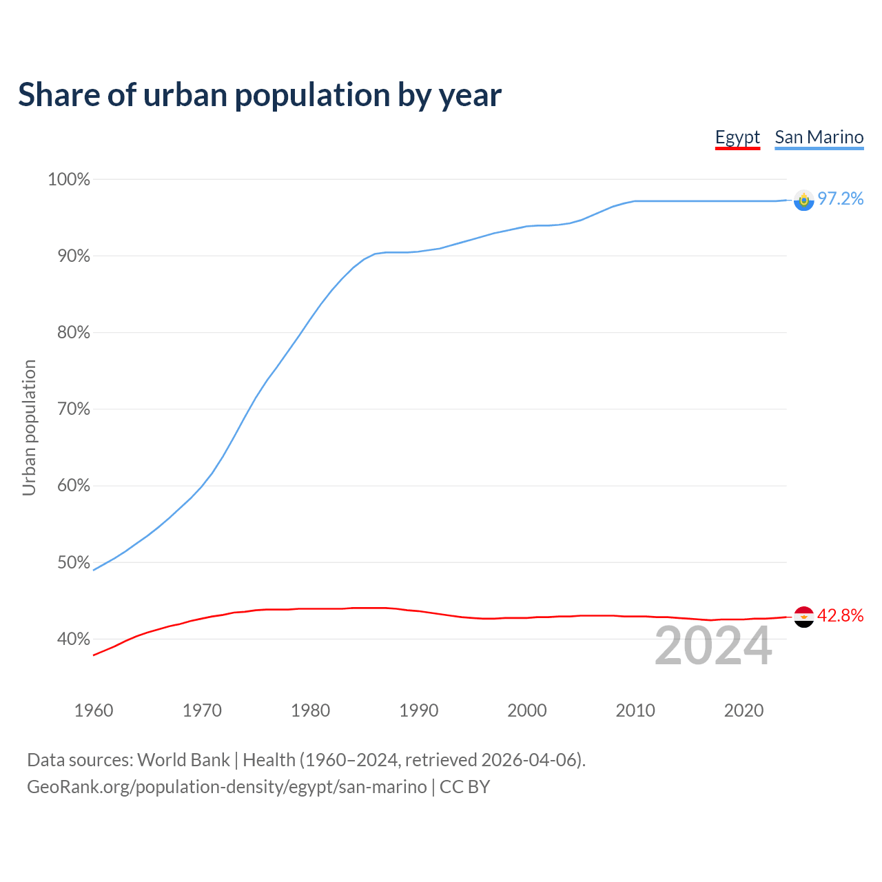From 2004 to 2024, the share of urban population changed from 42.9% to 42.8% in Egypt and from 94.2% to 97.2% in San Marino.