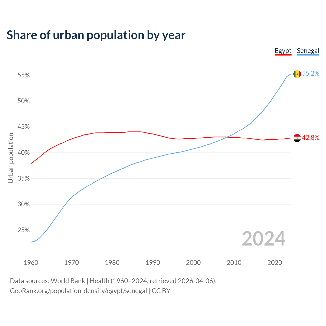 From 2004 to 2024, the share of urban population changed from 42.9% to 42.8% in Egypt and from 41.6% to 55.2% in Senegal.