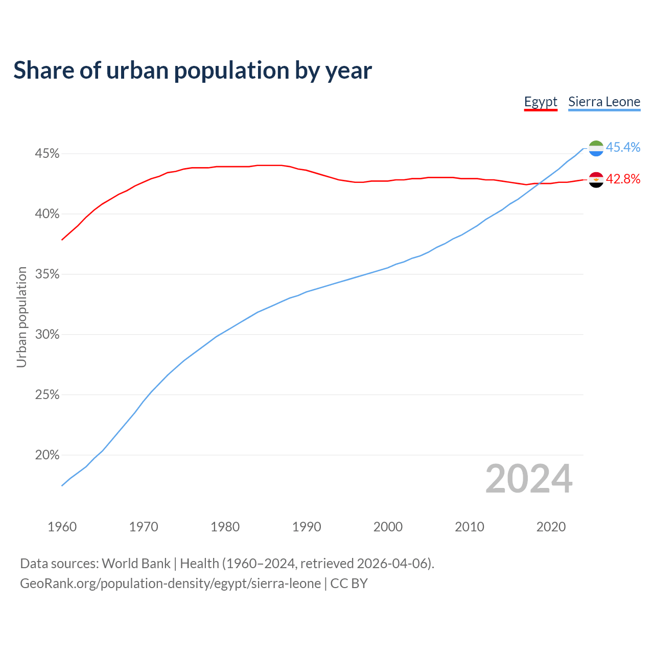 From 2004 to 2024, the share of urban population changed from 42.9% to 42.8% in Egypt and from 36.5% to 45.4% in Sierra Leone.