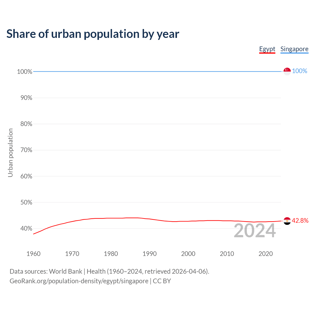 From 2004 to 2024, the share of urban population changed from 42.9% to 42.8% in Egypt and from 100% to 100% in Singapore.