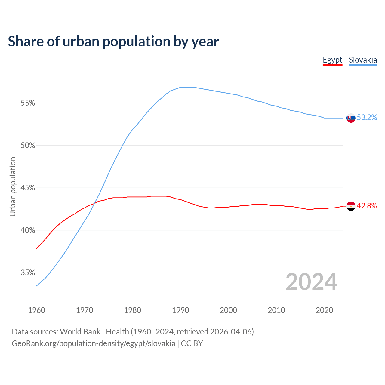 From 2004 to 2024, the share of urban population changed from 42.9% to 42.8% in Egypt and from 55.6% to 53.2% in Slovakia.