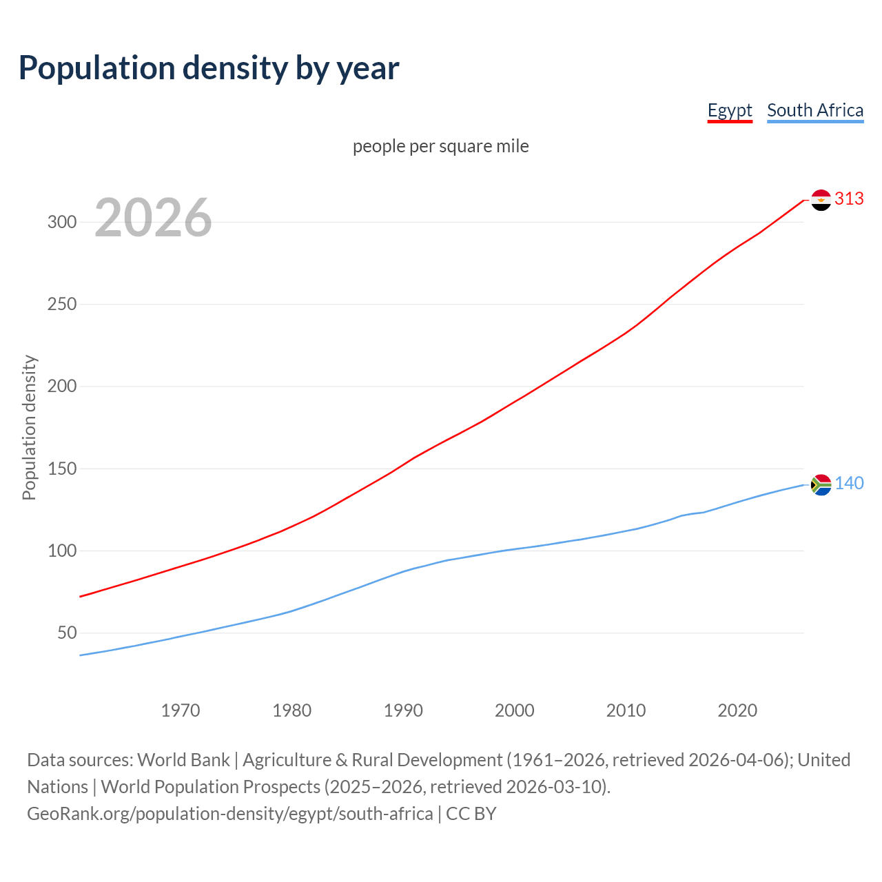 From 2006 to 2026, population density in Egypt increased by 45.4%, compared to a 31% growth in South Africa.