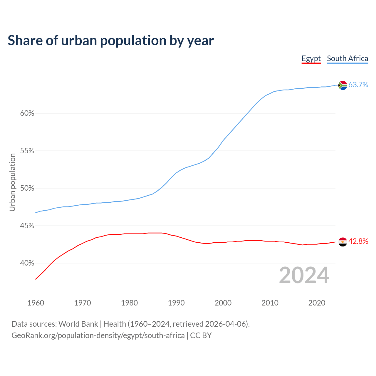 From 2004 to 2024, the share of urban population changed from 42.9% to 42.8% in Egypt and from 59.1% to 63.7% in South Africa.
