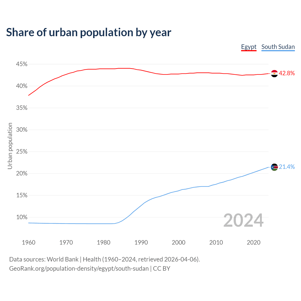 From 2004 to 2024, the share of urban population changed from 42.9% to 42.8% in Egypt and from 16.8% to 21.4% in South Sudan.