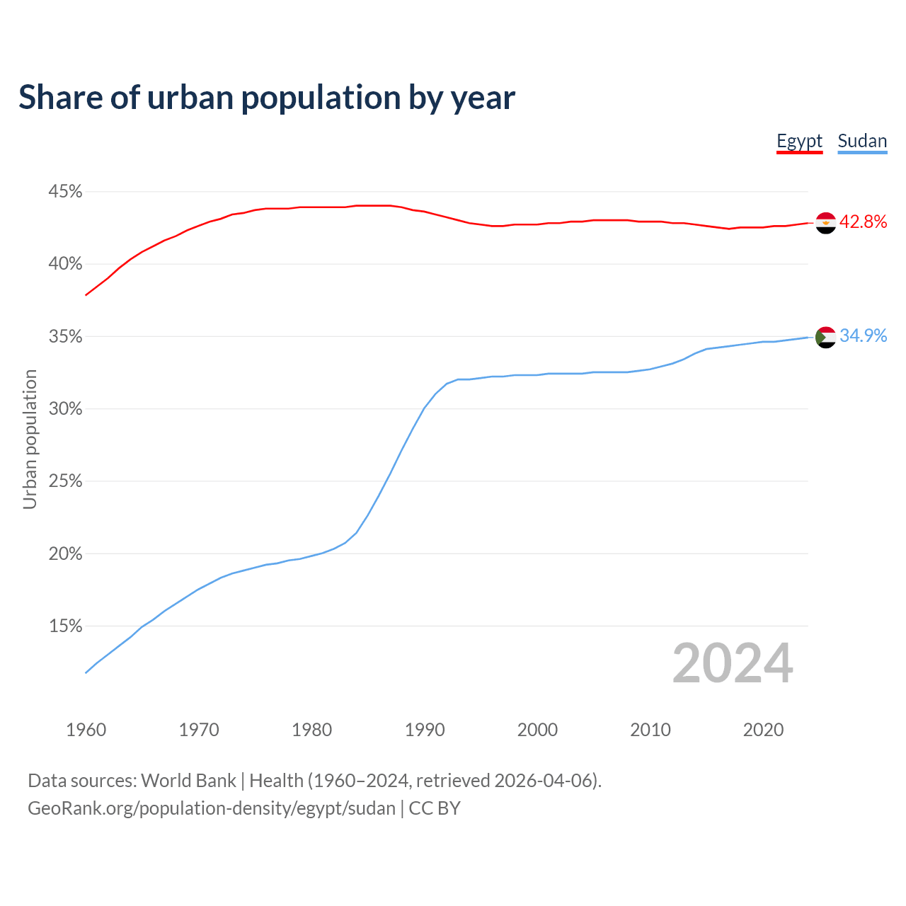 From 2004 to 2024, the share of urban population changed from 42.9% to 42.8% in Egypt and from 32.4% to 34.9% in Sudan.