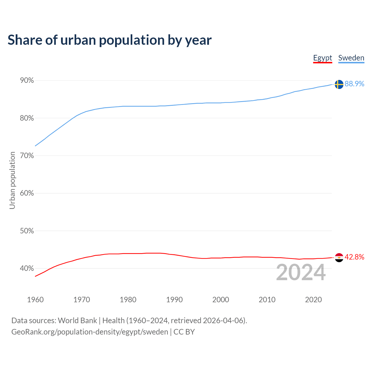From 2004 to 2024, the share of urban population changed from 42.9% to 42.8% in Egypt and from 84.3% to 88.9% in Sweden.