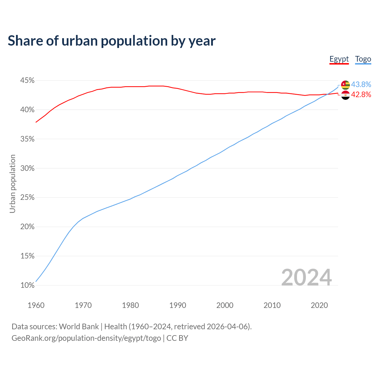 From 2004 to 2024, the share of urban population changed from 42.9% to 42.8% in Egypt and from 34.9% to 43.8% in Togo.