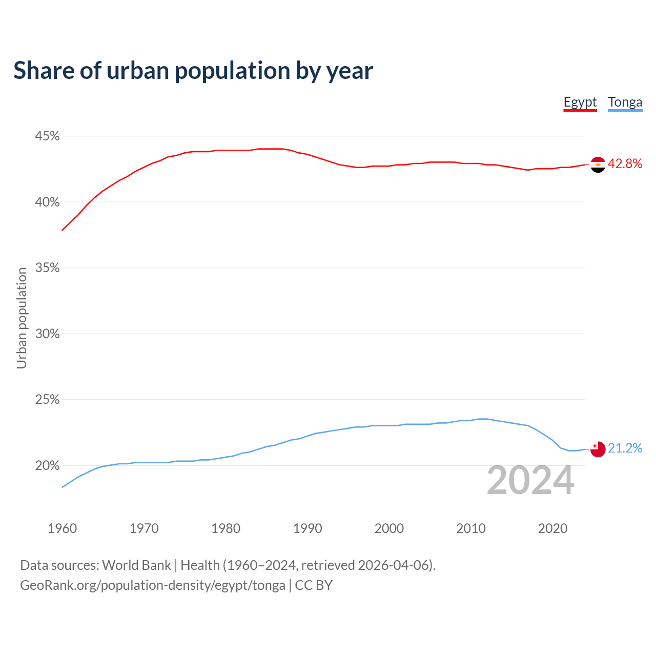 From 2004 to 2024, the share of urban population changed from 42.9% to 42.8% in Egypt and from 23.1% to 21.2% in Tonga.