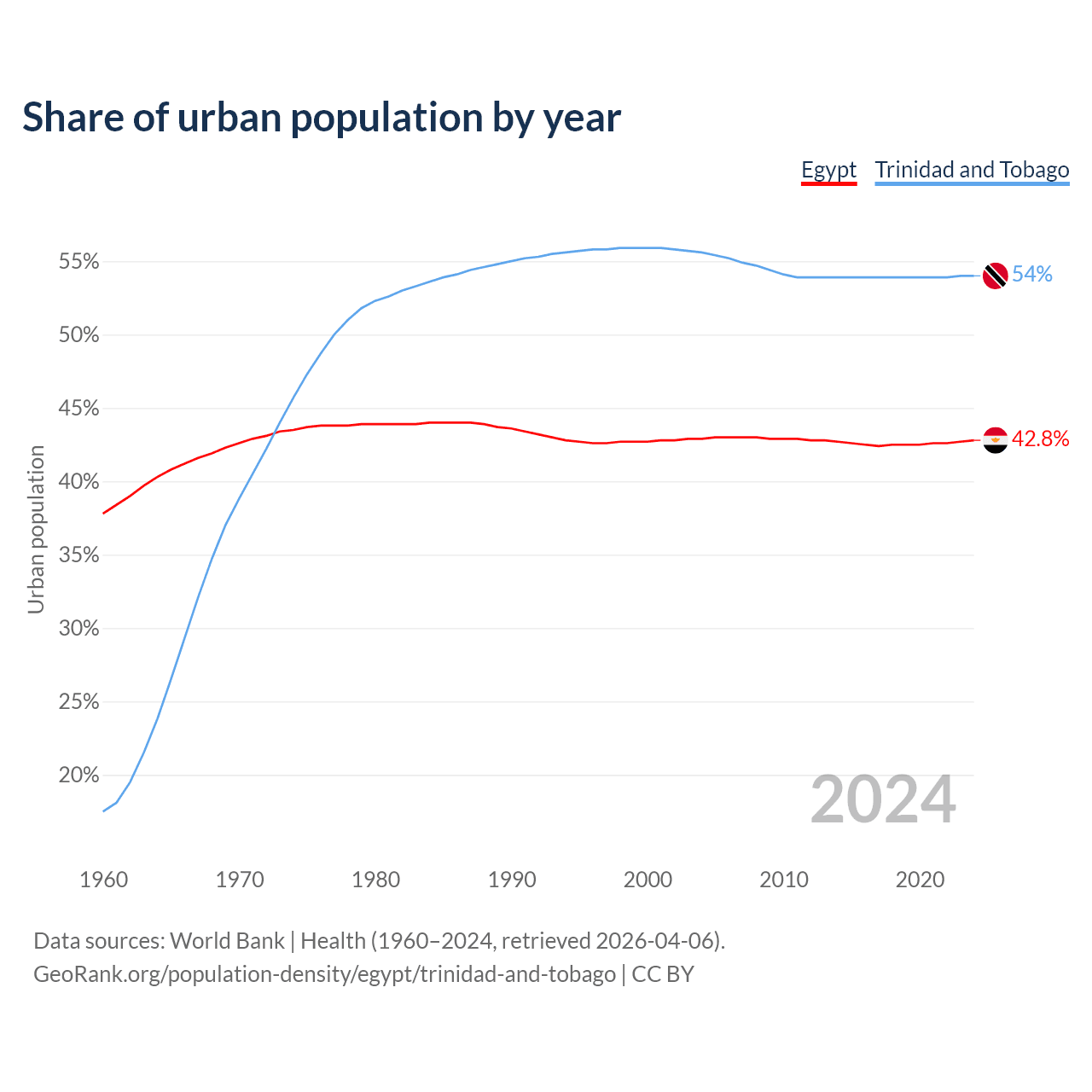 From 2004 to 2024, the share of urban population changed from 42.9% to 42.8% in Egypt and from 55.6% to 54% in Trinidad and Tobago.
