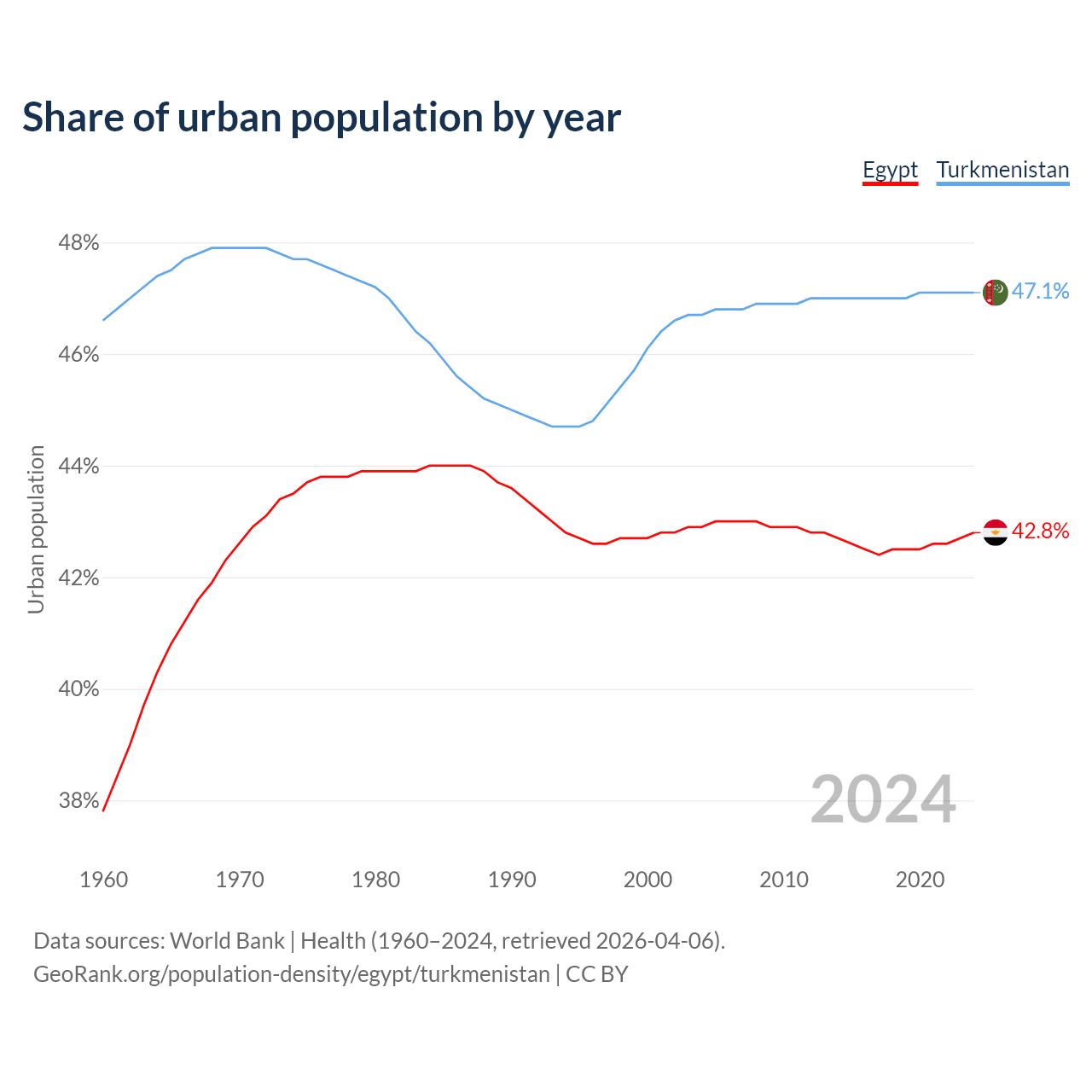 From 2004 to 2024, the share of urban population changed from 42.9% to 42.8% in Egypt and from 46.7% to 47.1% in Turkmenistan.