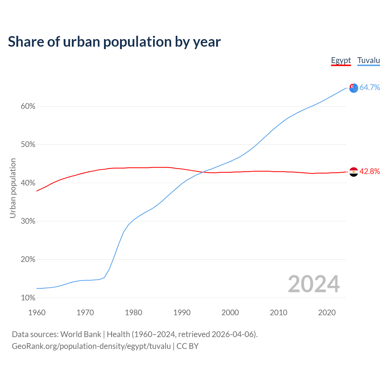 From 2004 to 2024, the share of urban population changed from 42.9% to 42.8% in Egypt and from 48.4% to 64.7% in Tuvalu.