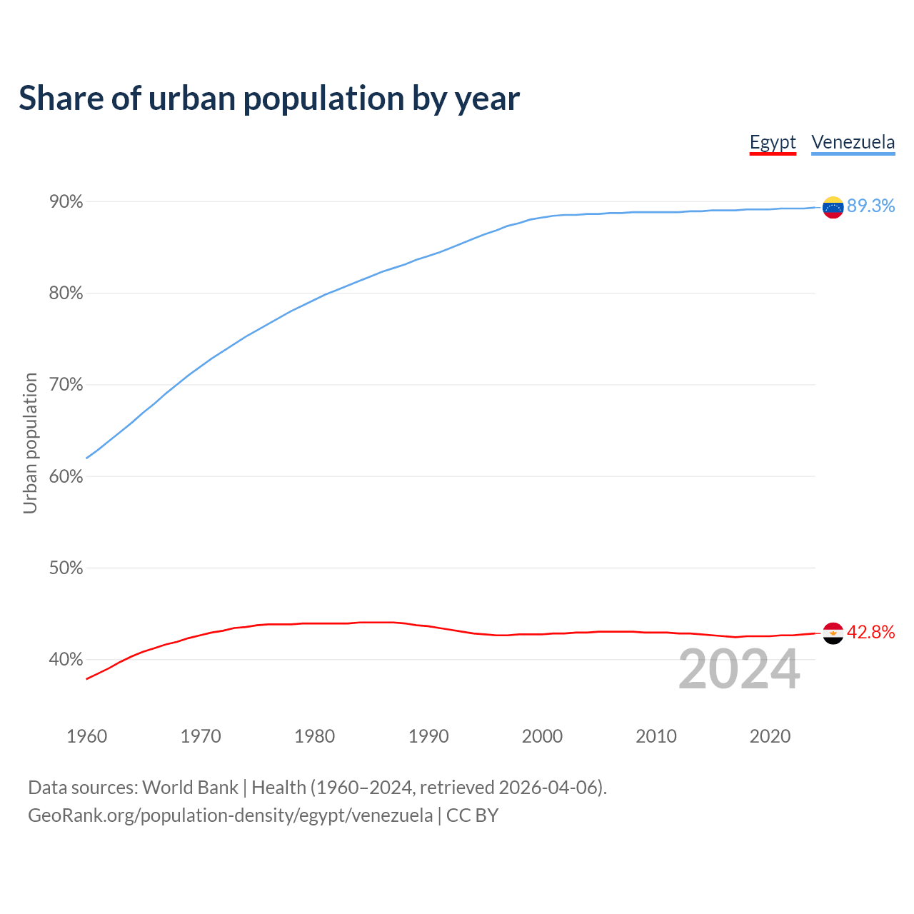 From 2004 to 2024, the share of urban population changed from 42.9% to 42.8% in Egypt and from 88.6% to 89.3% in Venezuela.