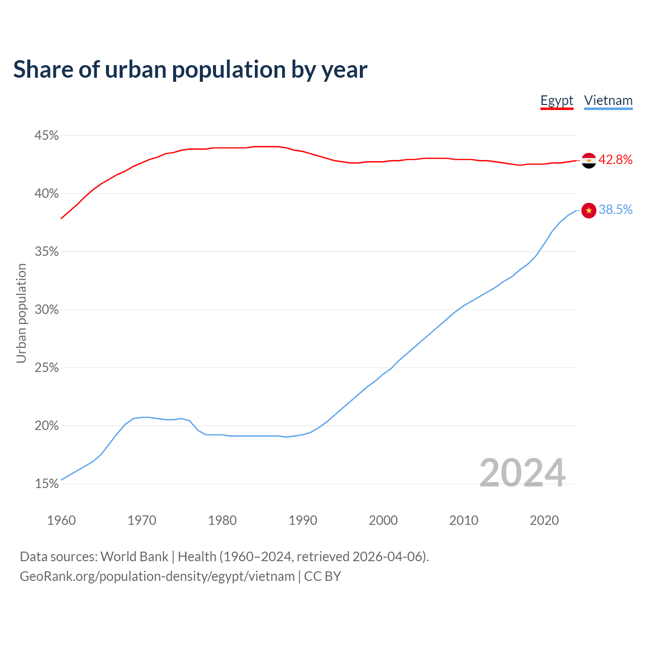From 2004 to 2024, the share of urban population changed from 42.9% to 42.8% in Egypt and from 26.8% to 38.5% in Vietnam.